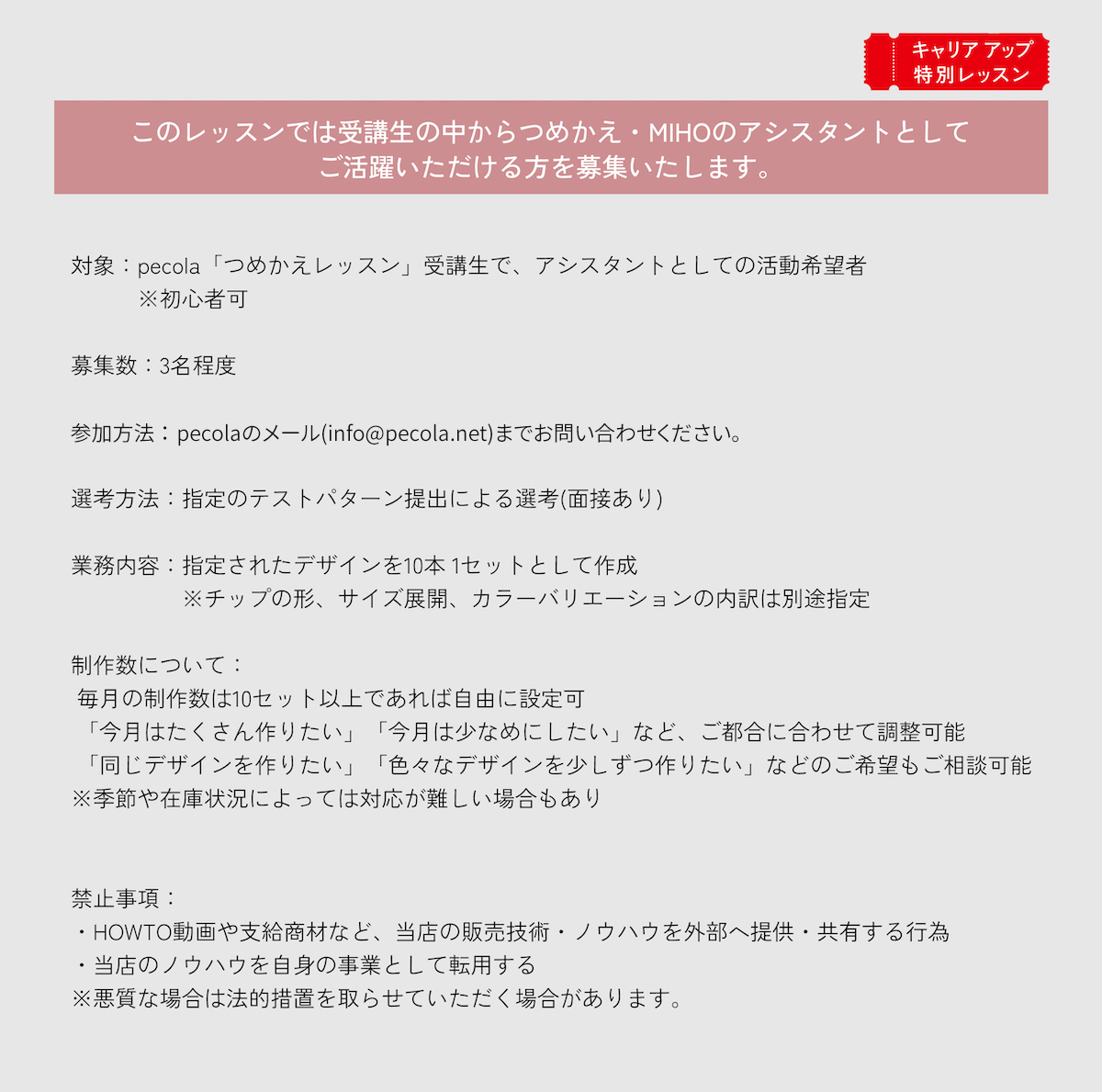 つめかえのアシスタントとして活動できる“キャリア付きレッスン“となっています。(3名程度の採用を予定)。